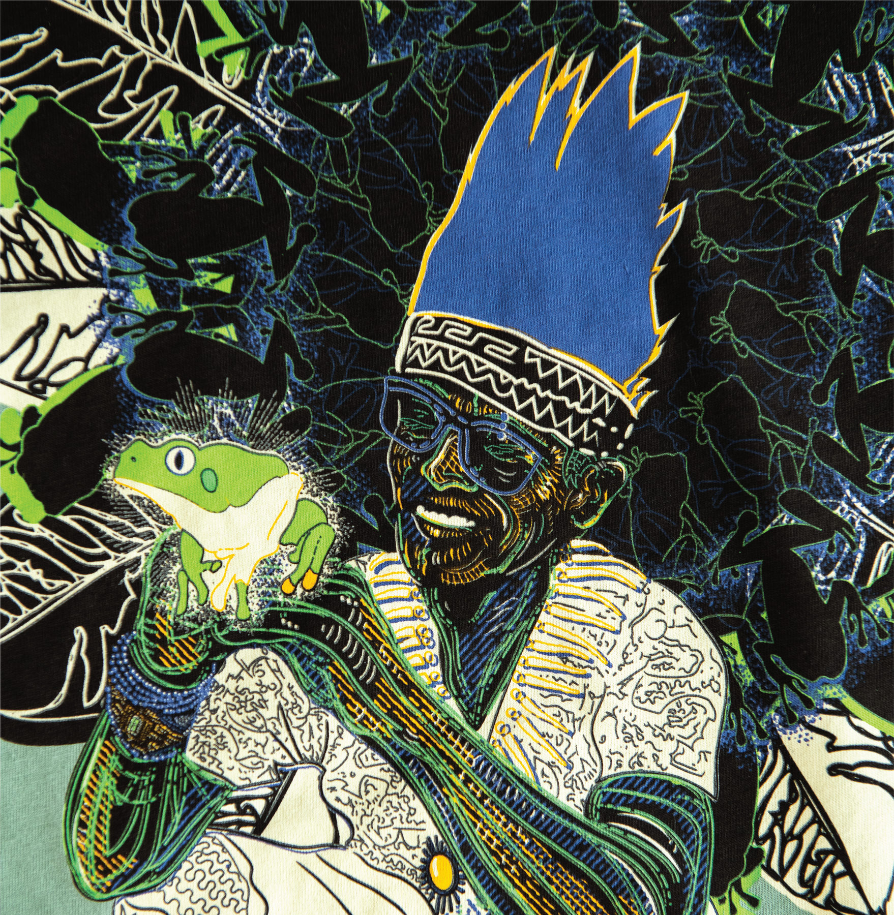 This image features a portrait of Maestro Javá, surrounded by a mandala of Toé and Kambô, with a bright green frog radiating from its seat on Jhonny's hands. All colors in this design were digitally captured from the Kambô frog! A small Kambô Frog climbs up the right sleeve, and our brand logo is featured on the left sleeve.